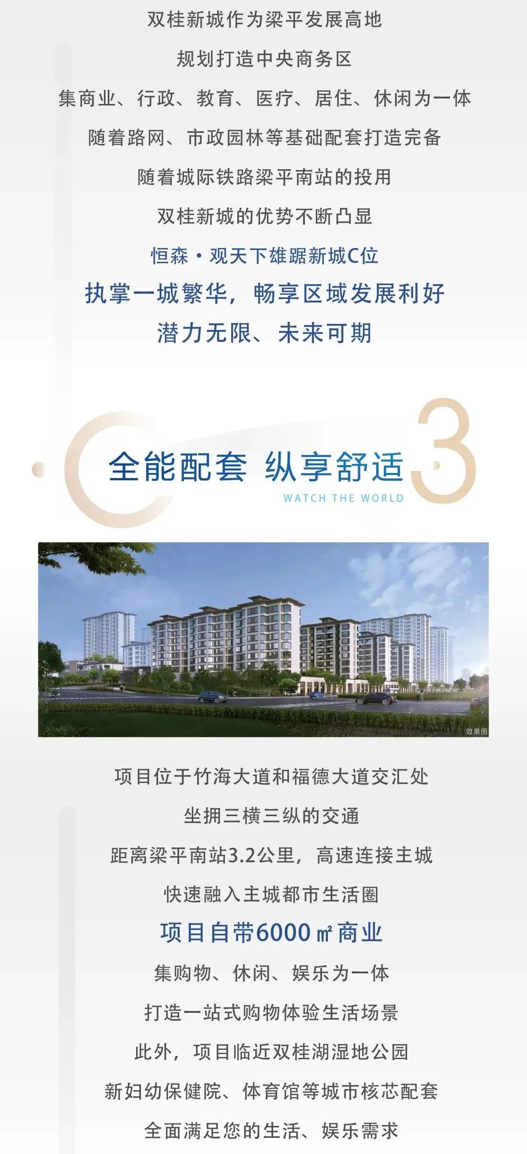免责声明:本资料为要约邀请,不视为要约,所涉面积均为建筑面积,所载文字以及相片、地图、印象示意图、标注图片等仅供参考用途,所有政府、政策信息均来源于官方披露信息,具体以实物、政府主管部门批准文件及买卖双方签订的商品房买卖合同约定为准。如有变化恕不另行通知。其中两图据摄图网,城区景色实图由高梁山人摄。本项目推广案名为恒森·观天下,政府备案核准名为恒森·观澜府。预售证号:渝梁住建委(2020)预字第(48)、(51)、(58)、(67)号,渝梁住建委(2021)预字第(1)号,本资料制作时间为2021年8月。