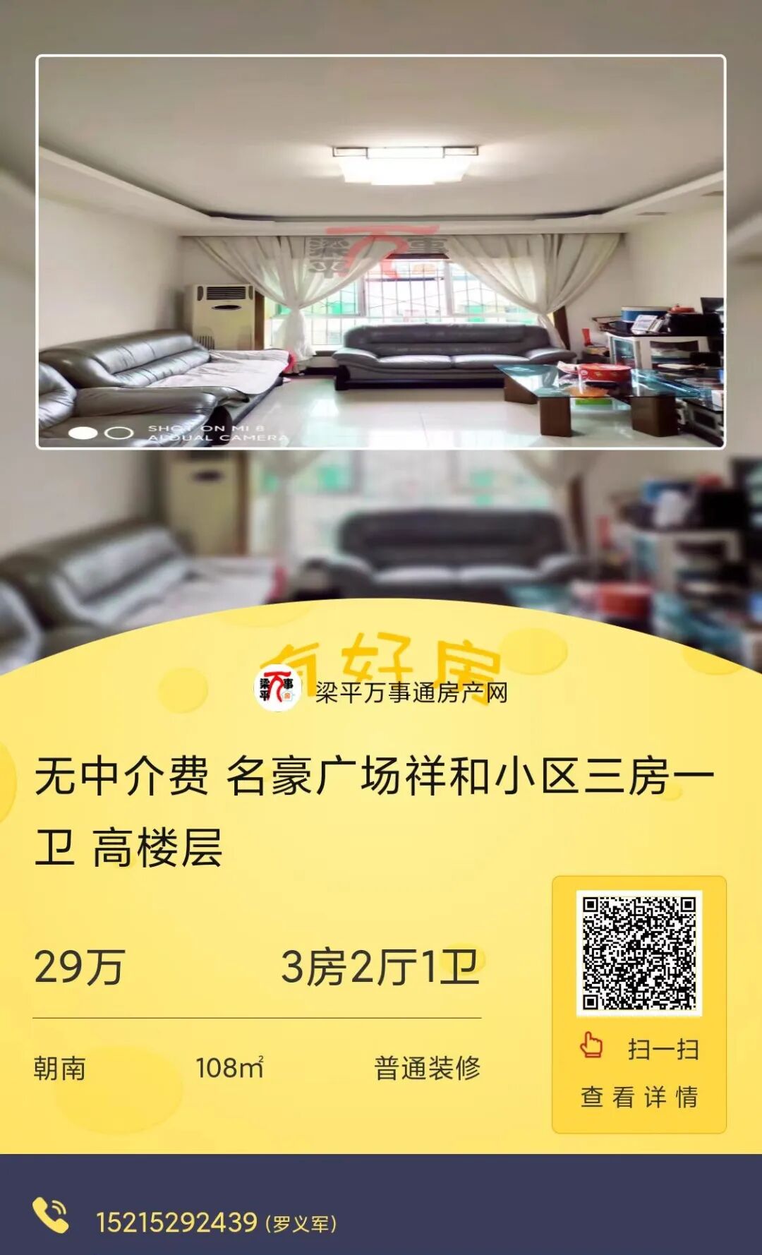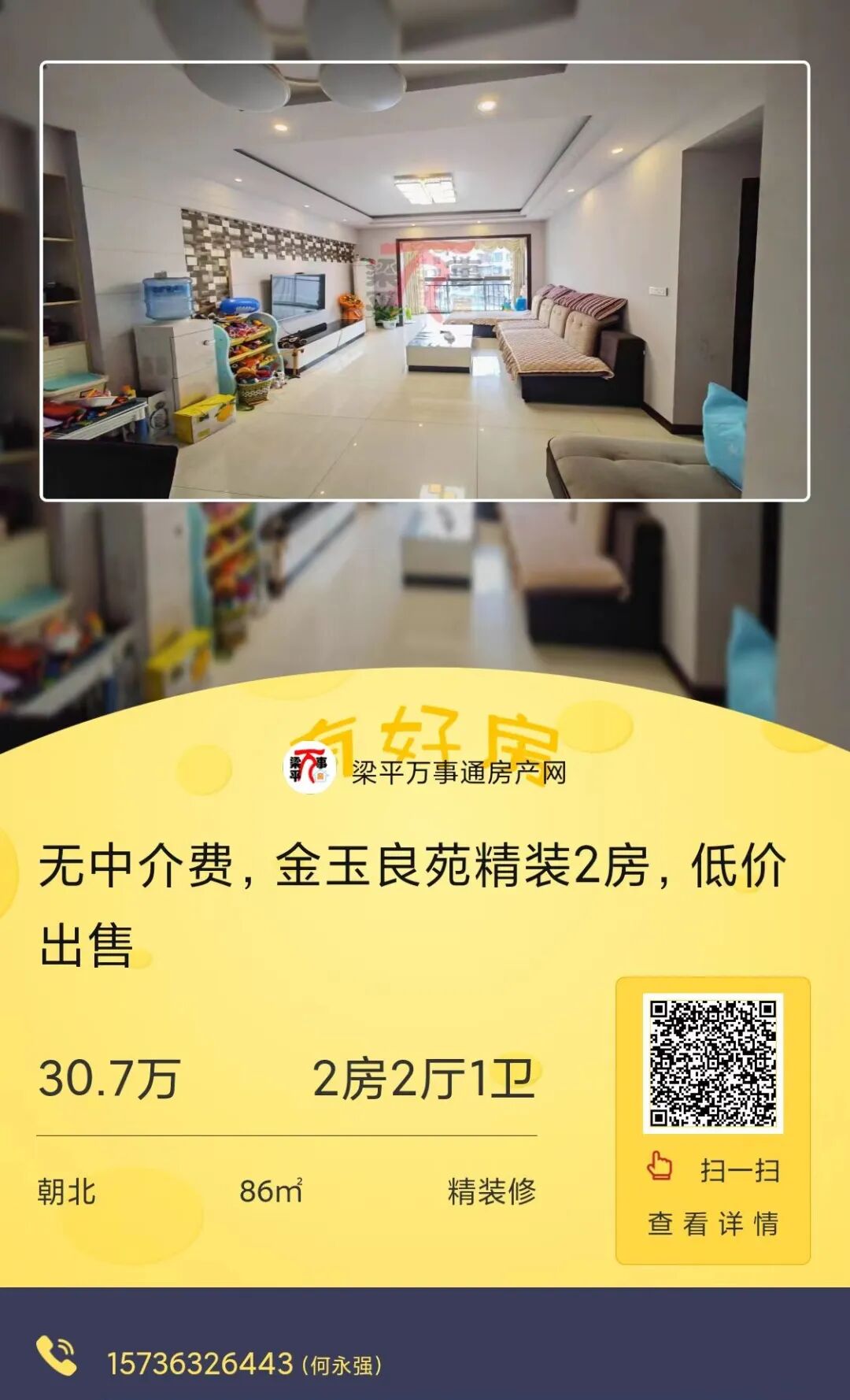 房源ID:1947809租金:17000元/年详情:2室1厅1卫 /80.0m2房源描述:房子整租,有意者电话联系随时看房。小区名:梁平时光小区朝向:朝南装修类型:普通装修(长按二维码查看详情)